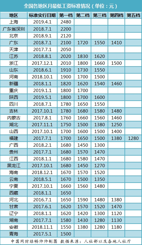 上海人社局此前公布消息,从2019年4月1日起,上海市职工月最低工资标准从2420元调整为2480元。此次上调额度为60元,较往年的一二百元的标准下降不少。